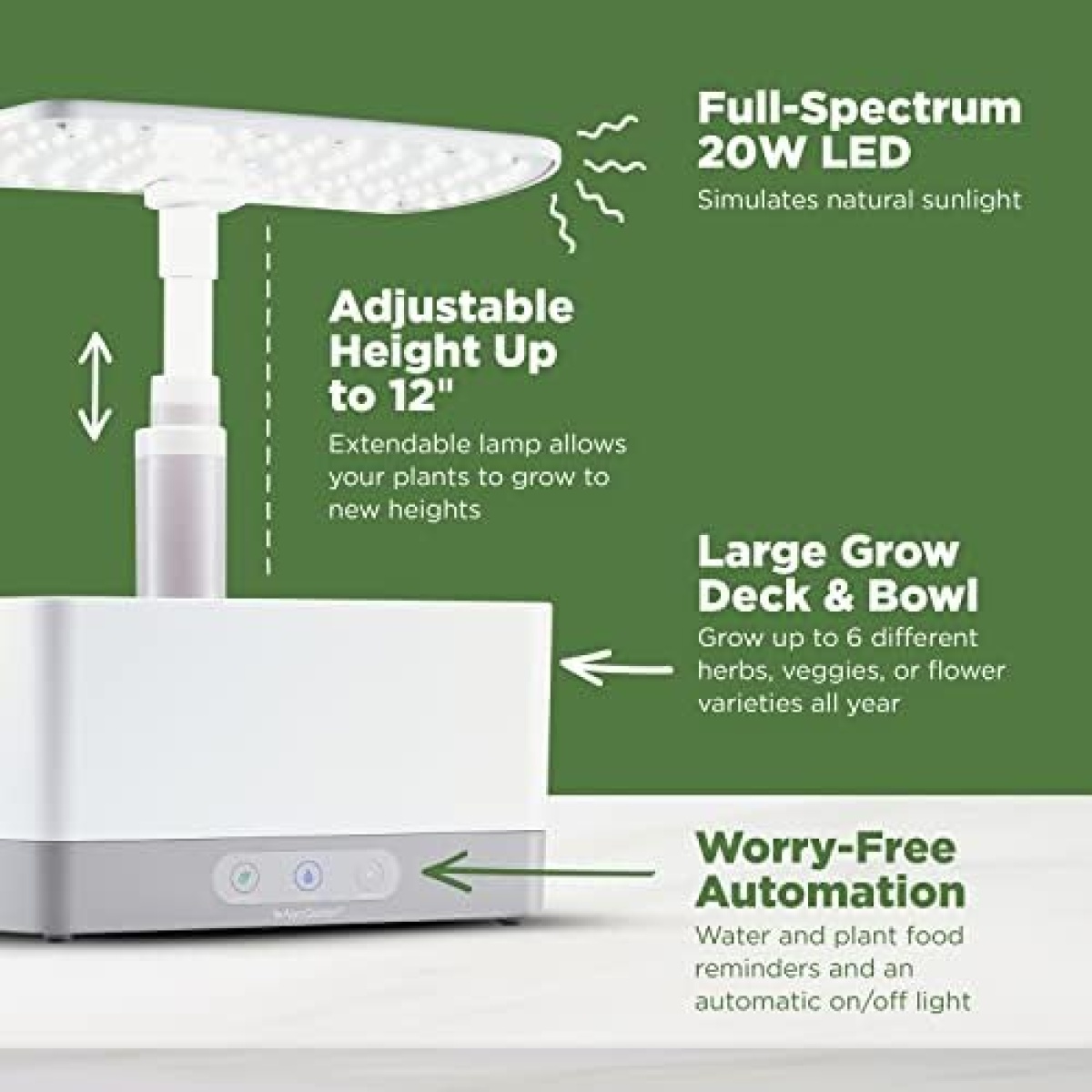 FEATURES AND BENEFITS: Our indoor garden’s touch-sensitive illuminated control panel reminds you when to add water and plant food, making for a simplified, worry-free gardening experience