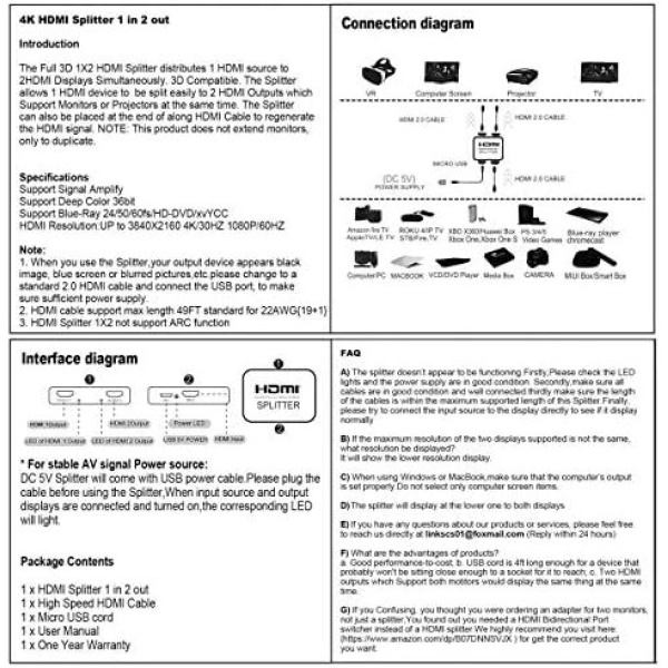 PACKAGE INCLUDED – 1 * [ 1 in 2 out HDMI Splitter], 1 * [USB cable(usb power adapter not included,Please plug the usb into a wall outlet,not a cable box etc…)],1*High Speed HDMI Cable