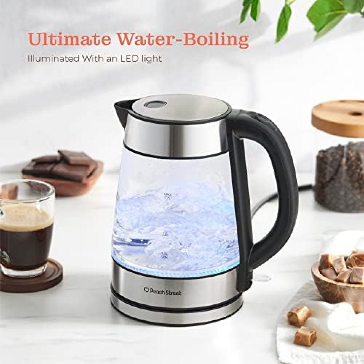 Durable Glass-Of attractive borosilicate glass and brushed 304 stainless steel, the hot water heater will last for years to come, adding a unique charm to your kitchen. The exterior is brilliantly clear and stain-free with marked measurements for precise pouring.