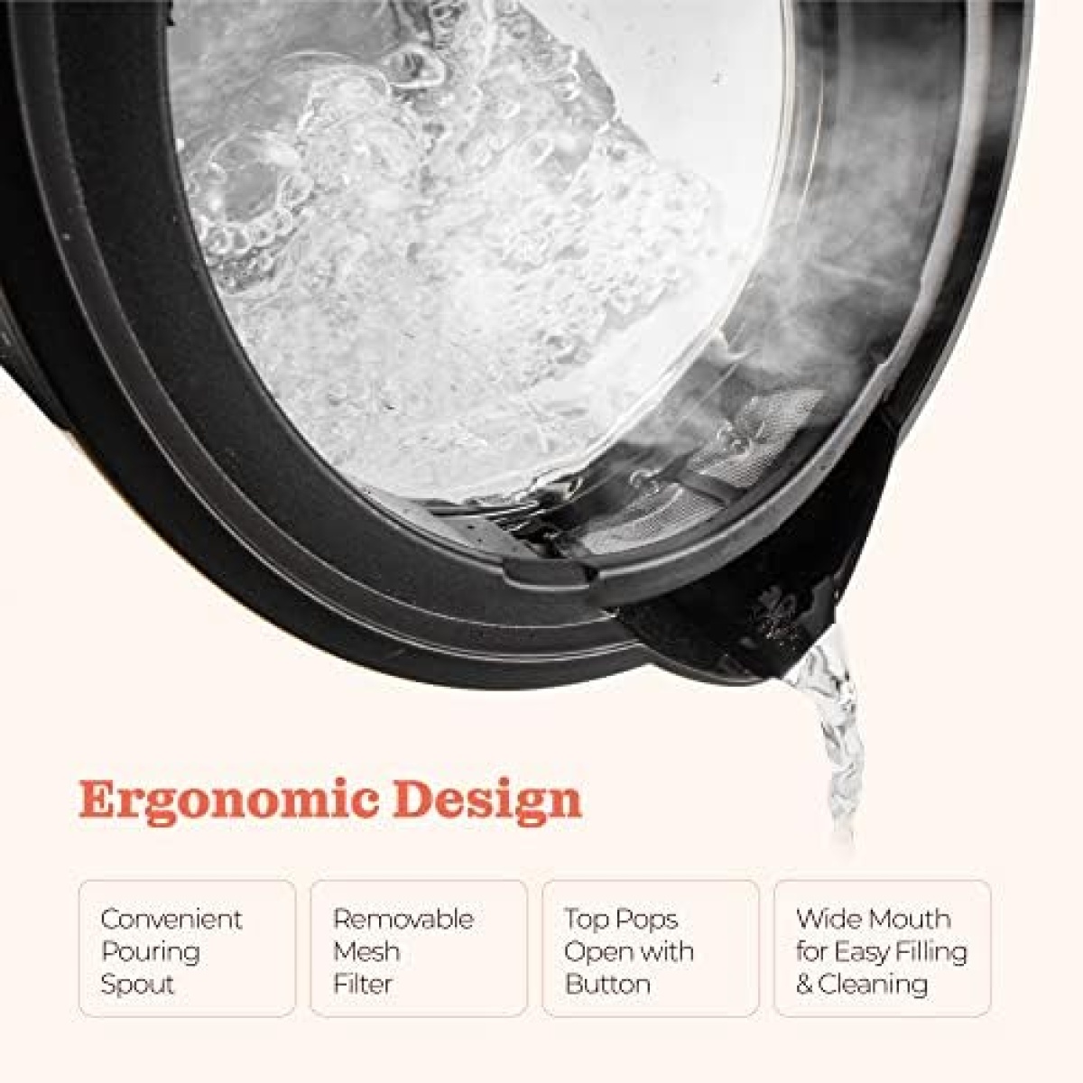 Ergonomic Design-This electric tea kettle has a built-in mesh filter that lets you put tea bags or fruit in the water with just the water passning through. The top pops open with the touch of a button, and the wide mouth makes for effortless refilling and cleaning.e-With a 360° rotating base, you can easily access the kettle H₂O boiler from all angles. Off the base, the kettle is entirely cordless for smooth pouring. Neatly store the cord beneath the base in a specially designed storage slot.